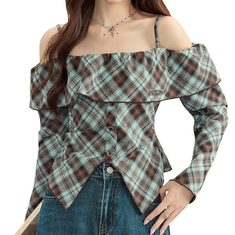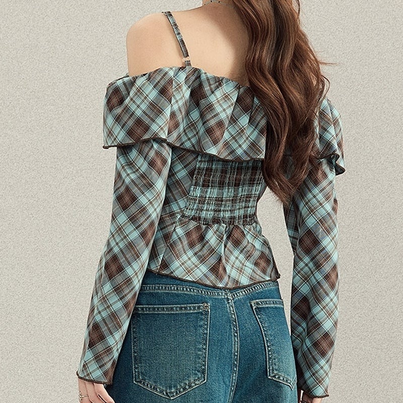 Plaid off shoulder blouse 1125